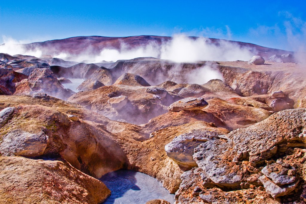 First, head to the Geyser Sol de Mañana, and a bit later on, time permitting, you will have the opportunity to warm up when you take a bath in the natural thermal water of the hot springs.